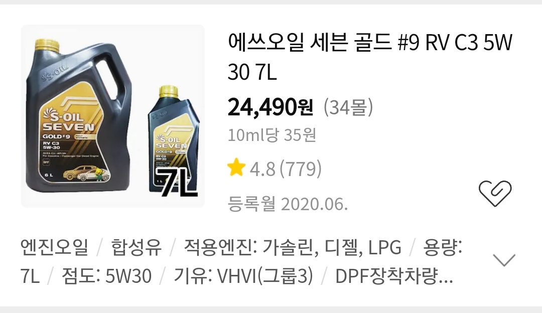 매번 에스오일 [세븐골드 #9 RV C3 5w30] 을 구매했었는데요.